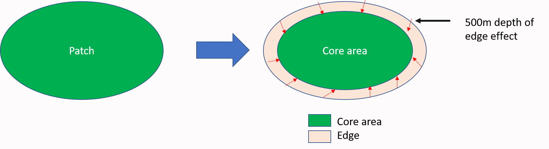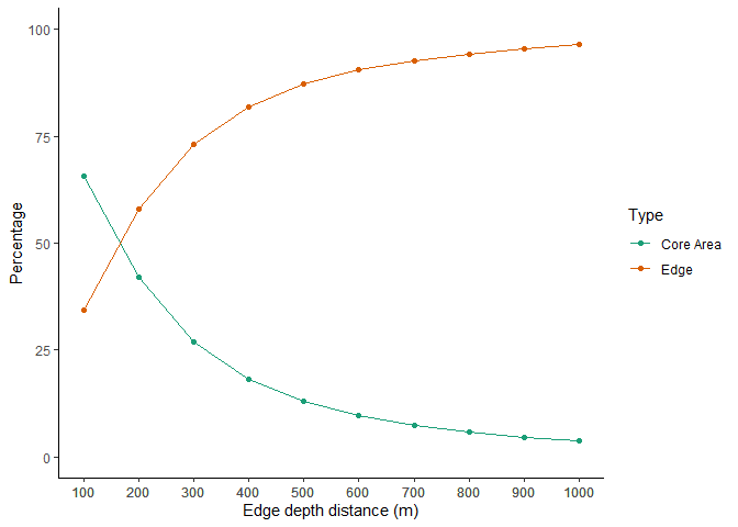 We can make a loop where we explore different edge depths. In the following example, We will explore 10 edge depths (edge_distance argument): 100, 200, 300, 400, 500, 600, 700, 800, 900 and 1000 meters. We will apply the ‘MK_Fragmentation()’ function using the previous distances and then, we will extract the core area percentage and edge percentage statistics. Finally, we will plot the average of the patch core area percentage and edge percentage (% core area + % edge = 100%).