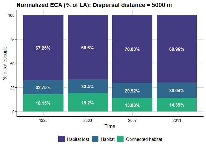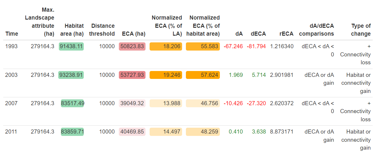| MK_dECA | Estimate the Equivalent Connected Area (ECA) and compare the relative change in ECA (dECA) between time periods using one or several dispersal distances. It uses the ‘distancefile()’. |